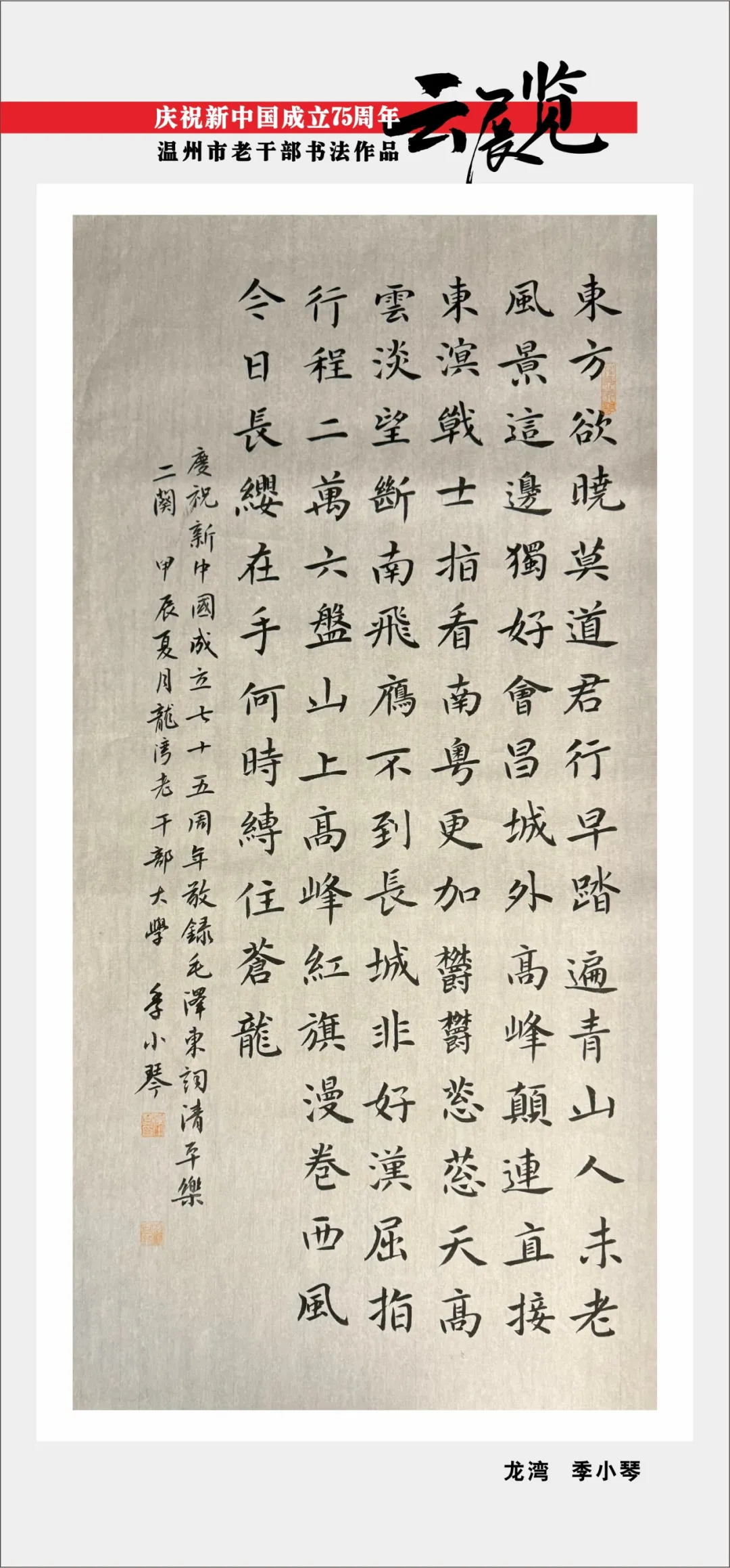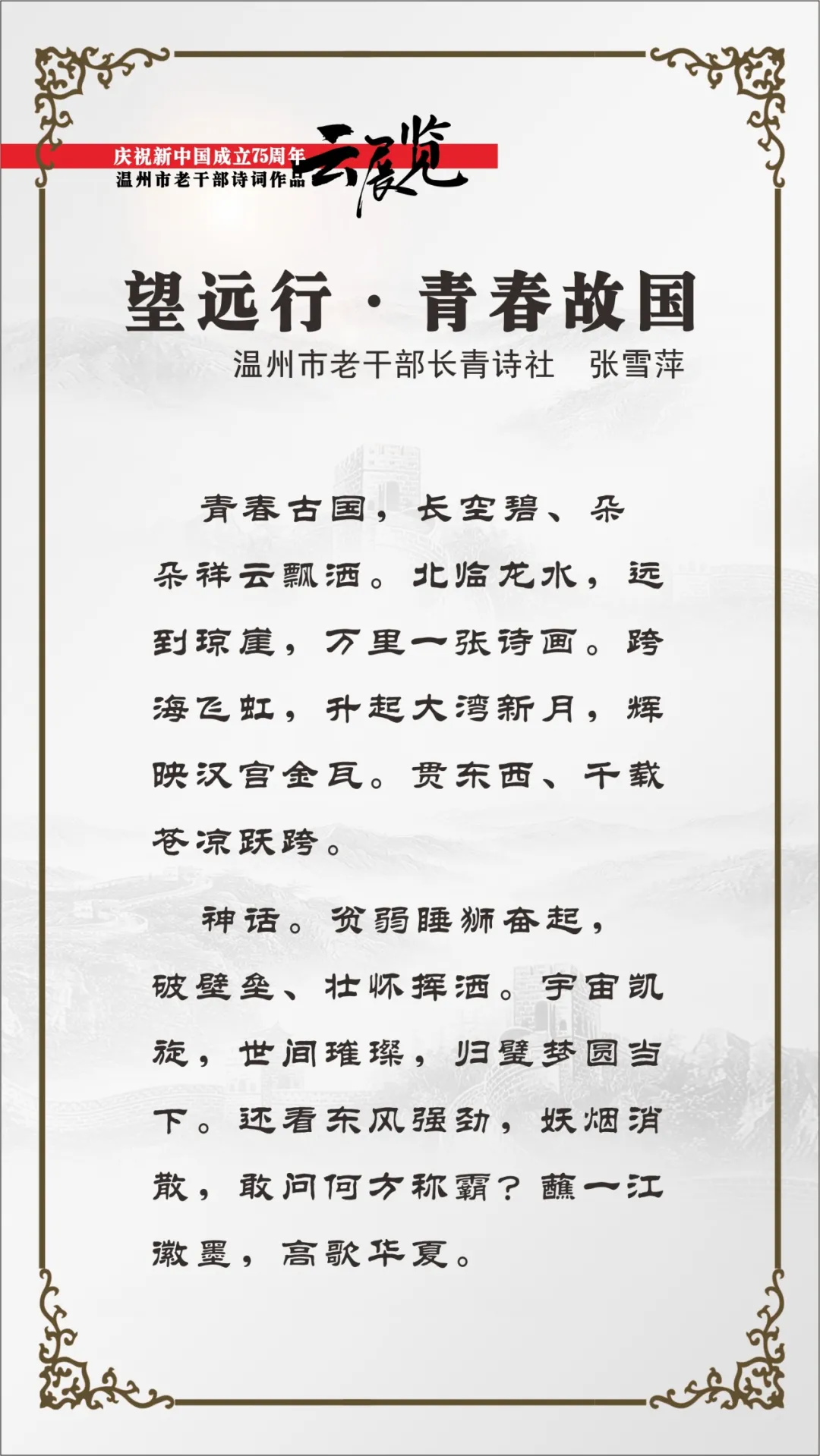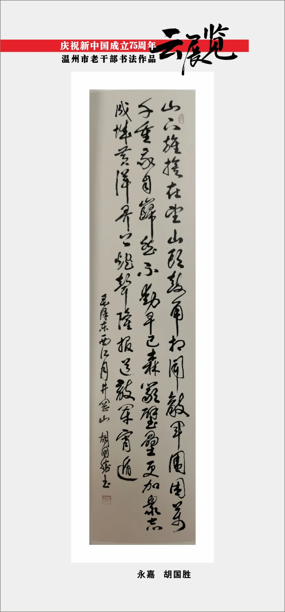 翰墨书盛世,丹青绘风华。为喜迎中华人民共和国75周年华诞,温州市委老干部局举办庆祝新中国成立75周年温州市老干部主题作品云展览。本次云展览将分批展出老同志的诗词、书画、摄影、篆刻、剪纸等作品约180幅,其作品内容积极向上,艺术趣味高雅,形式丰富多彩,充分展现出推进强国建设、民族复兴伟业的壮美华章,有力表达了温州老干部礼赞新中国、奋进新时代的美好祝愿。下面,请欣赏老同志创作的精彩作品。