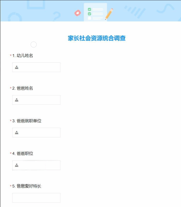 据家长所述,这份调查是由家长委员会发出的,并非教师团队。该问卷调查共包含13项内容,包括“爸爸就职单位”“爸爸职位”“爸爸爱好特长”“妈妈就职单位”“妈妈职位”“妈妈的爱好特长”等信息。除此之外,调查还询问了家长可以为幼儿园提供的资源类型,如,社会实践资源:例如消防队、科技馆等,方便安排幼儿参观活动,旨在拓宽幼儿视野和开展公益活动;物质资源:如玩具、幼儿生活用品、美术装饰材料等;培训资源:可以利用家长的职业和资源优势,为幼儿或家长提供相关培训;时间资源:志愿服务,可以在幼儿园开展活动时协助园里老师促进工作;精神支援:因工作繁忙或其他隐私因素无法经常陪伴或提供其他资源。