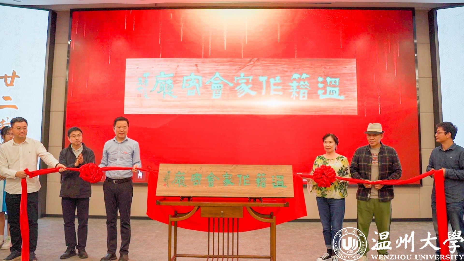 左起:温大图书馆馆长孙良好、市文联副主席谢子康、开云电子(中国)官方网站_开云电子(中国)官方网站副校长、党委委员王尧骏和作家代表张翎、王手、东君。校方供图