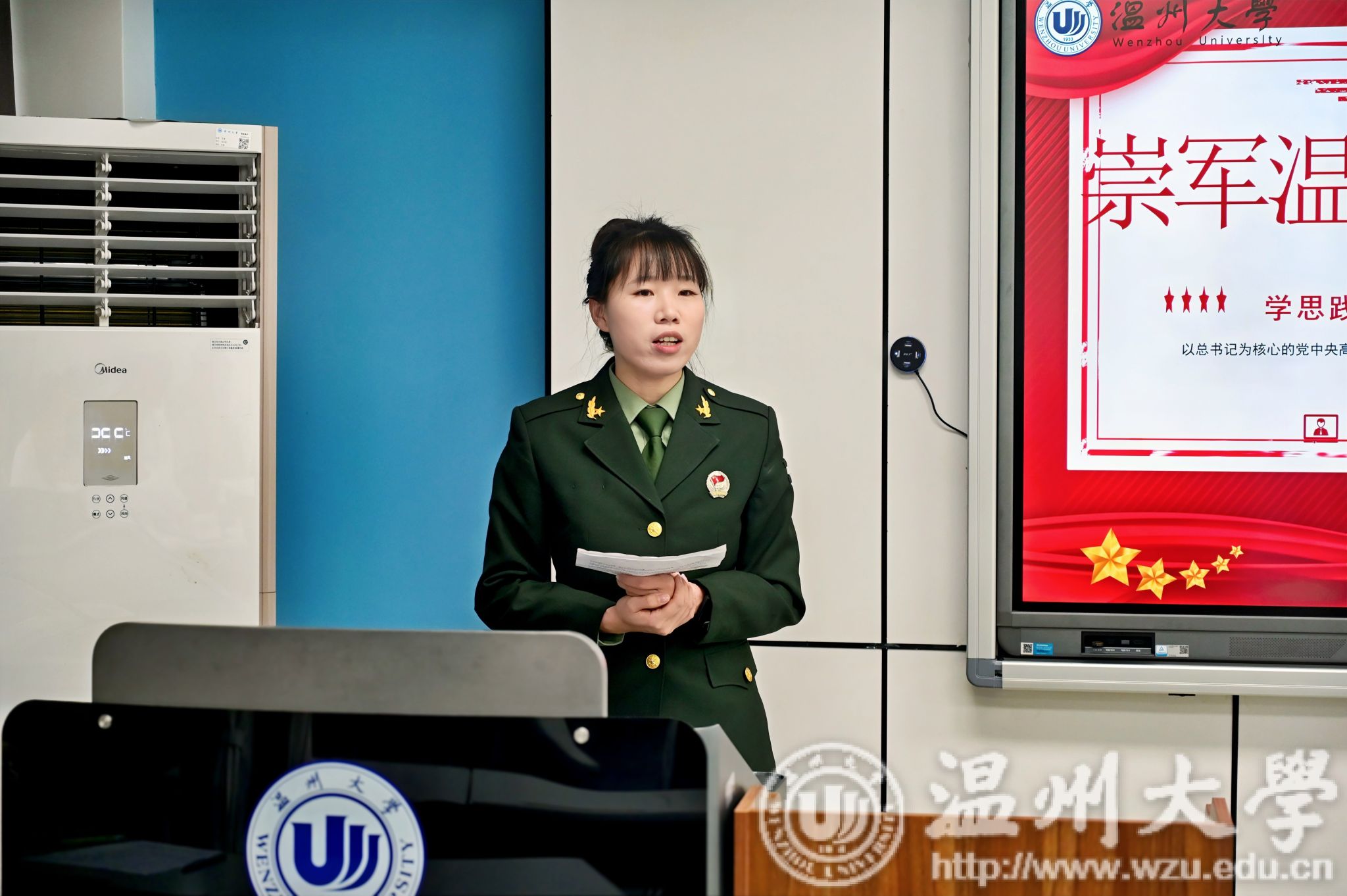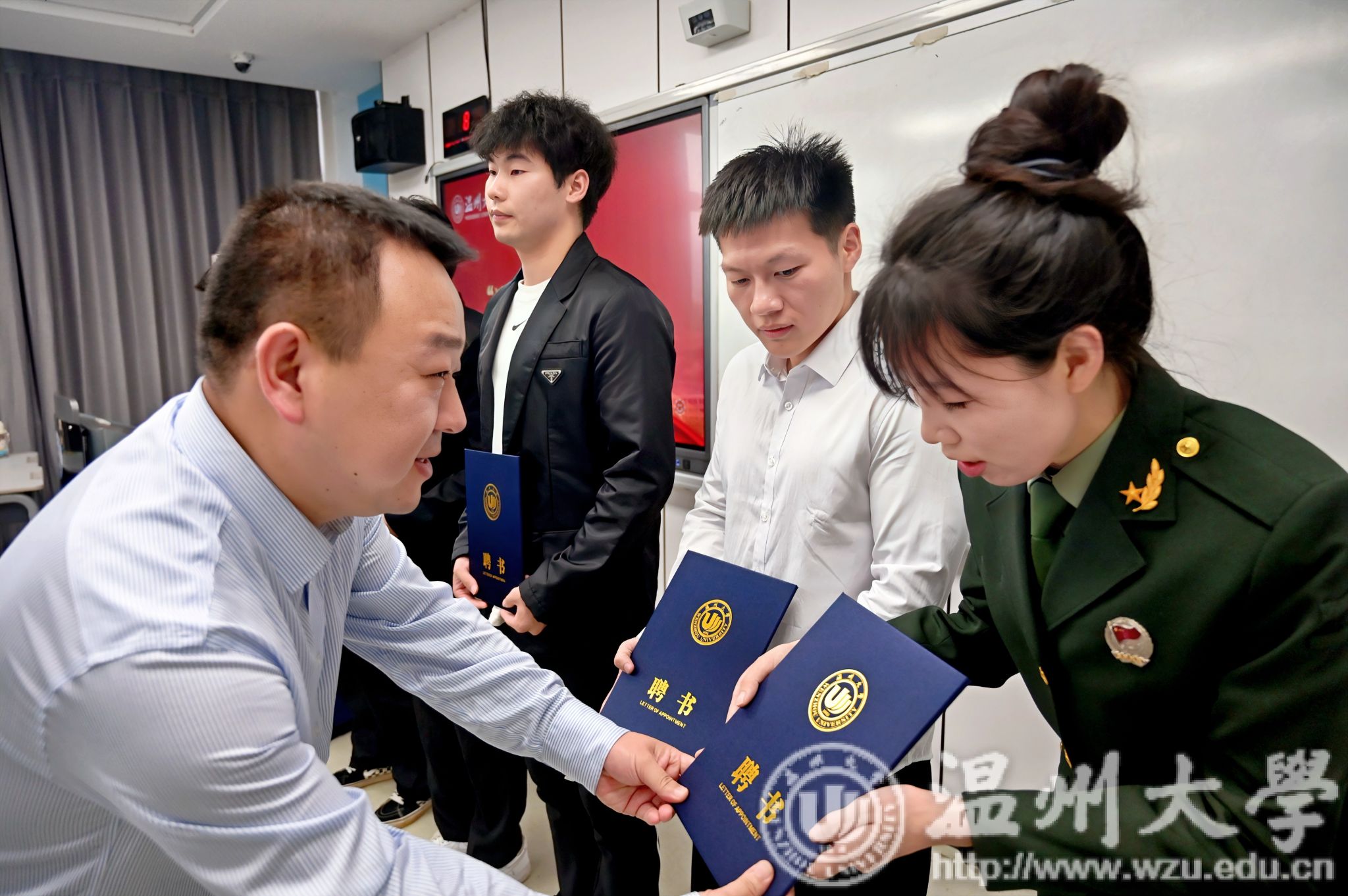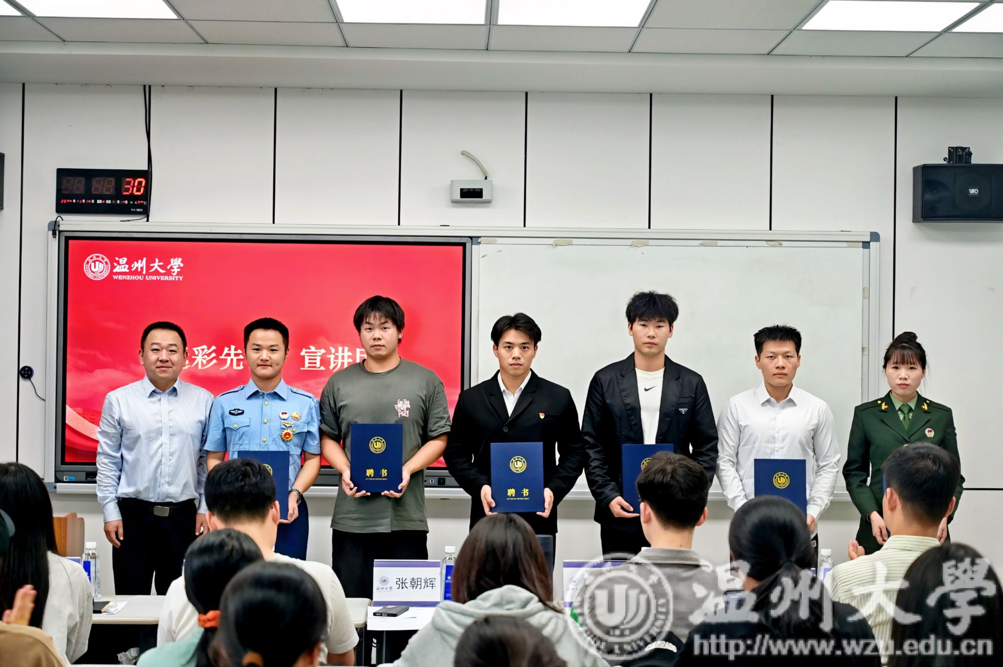 张朝辉为首批宣讲团成员颁发聘书,他强调,“迷彩先锋”宣讲团的成立不仅是为了传承和弘扬军人精神,更是为了激励更多的温大学子投身于国防事业和国家建设中去,希望他们在未来的道路上,牢记“退伍不褪色、退役不退志、离军不离党”的光荣使命,继续用铮铮誓言唱响强军“战歌”。