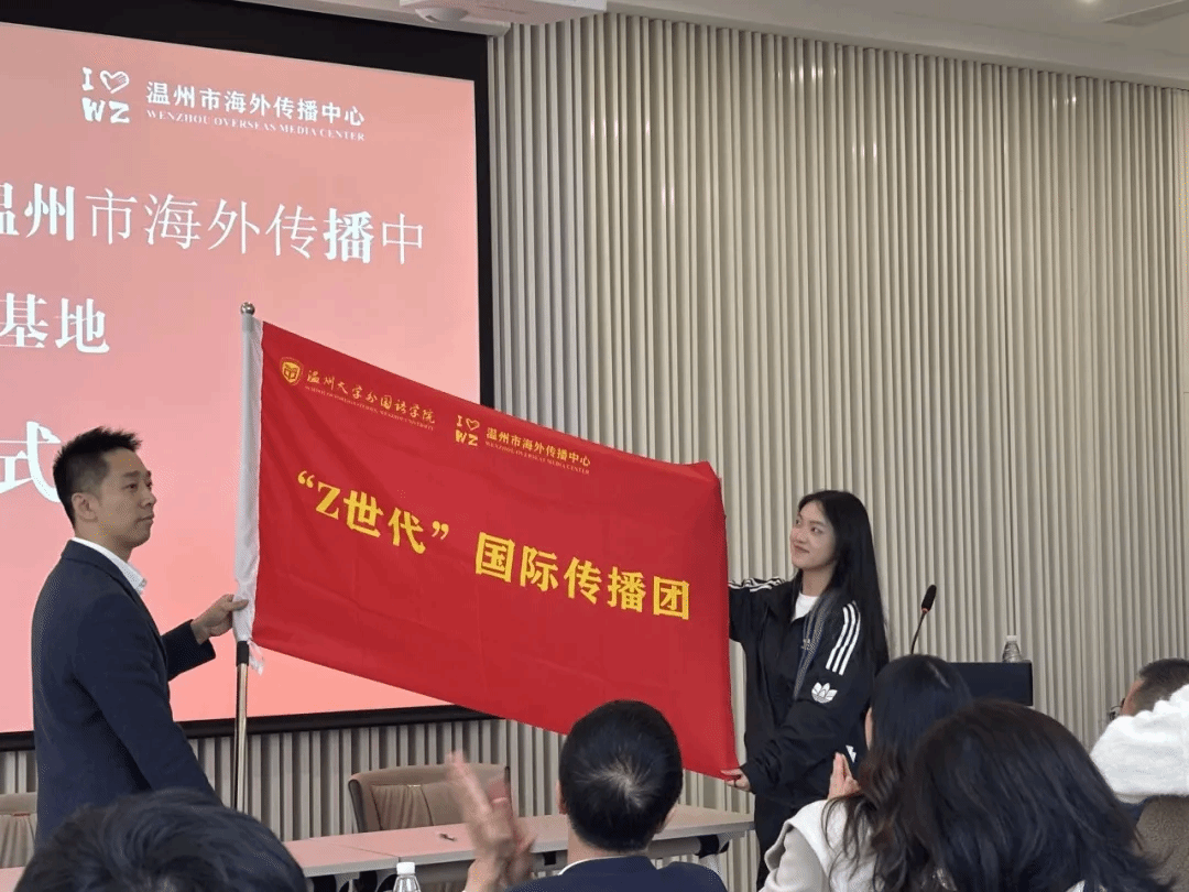 随后,举行了庄重的签约仪式,双方就平台共建、资源共享、价值共创、发展共赢等系列合作事宜签订协议,楼了凡主任和杨丽君书记为温州市海外传播基地颁授大学生校外实践基地牌子,学院还聘请许鹏怀主任担任研究生校外导师和大学生创新创业导师。作为影响社会发展的新生力量,近年来“Z世代”青年在对外交流中逐渐成为主力军,为进一步凝聚国际传播“Z世代”力量,开云电子(中国)官方网站_开云电子(中国)官方网站外国语学院与温州市海外传播基地联合建立“Z世代”国际传播团,来自温大外国语学院英语、翻译、日语专业的25名学生成为团队首批成员。市委宣传部史宇翔处长为传播团授旗,“Z世代”国际传播团队长、温大外国语学院23级翻译专业陈靖谕同学在接旗后表示,“团队将不负重望,积极承担起传播温州文化、中国文化的使命,在新时代语境下创新传播方式,讲好温州故事、讲好中国故事。”