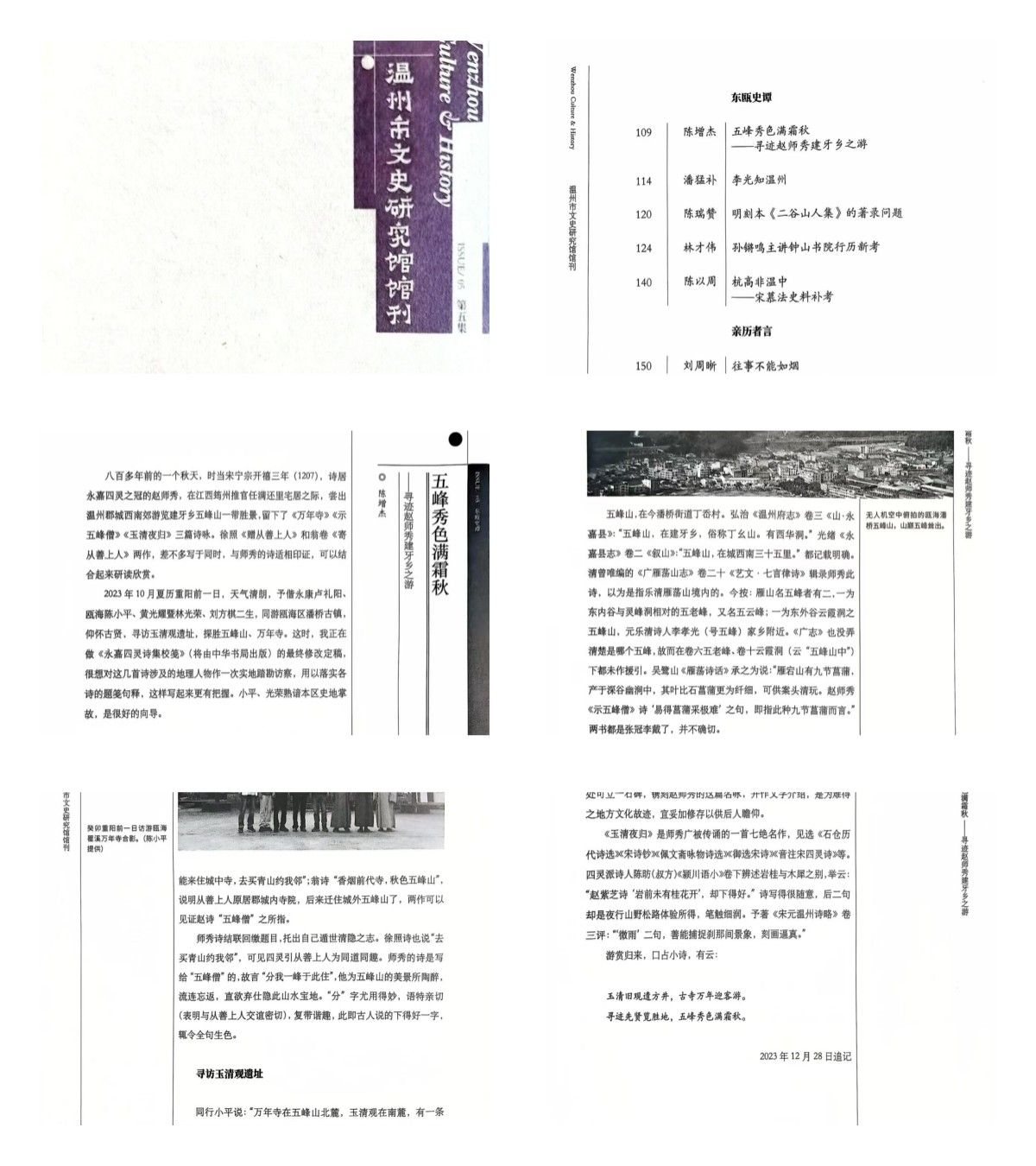 2023年10月夏历重阳前一日,天气清朗,予偕永康卢礼阳、瓯海陈小平、黄光耀暨林光荣、刘方棋二生,同游瓯海区潘桥古镇,仰怀古贤,寻访玉清观遗址,探胜五峰山、万年寺。这时,我正在做《永嘉四灵诗集校笺》(将由中华书局出版)的最终修改定稿,很想对这几首诗涉及的地理人物作一次实地踏勘访察,用以落实各诗的题笺句释,这样写起来更有把握。小平、光荣熟谙本区史地掌故,是很好的向导。