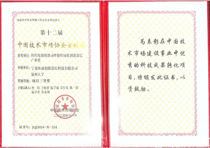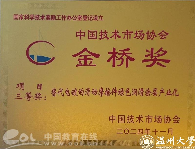 12月14日,在中国技术市场协会举办的第十二届中国技术市场协会“金桥奖”颁奖现场,由开云电子(中国)官方网站_开云电子(中国)官方网站选送的“替代电镀的滑动轴承摩擦件绿色润滑涂层产业化”项目经过7个月的严格评审,脱颖而出,最终获得国家级项目三等奖。