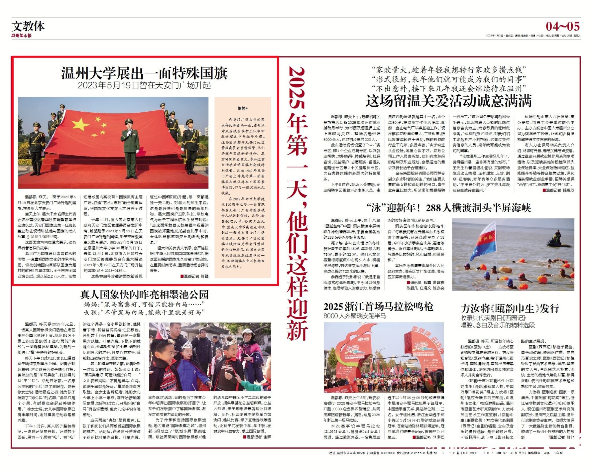 这些被编号珍藏的国旗都曾见证过中国朝阳的升起,每一面都是独一无二的。对温大的师生来说,这是最特殊也是最珍贵的新年礼物。温大国旗护卫队队长、该校电气与电子工程学院学生吴芳玲说:“当这面承载着无数荣耀与祝福的国旗被郑重地交托到我们手中时,全体队员都感到无比的激动和自豪。”