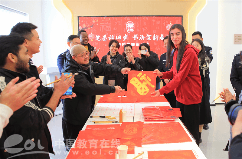 国际教育学院与茶山派出所共同举办了以“笔墨辞旧岁,书法贺新春”为主题的特色活动。活动现场,墨香四溢。在专业书法老师的指导下,留学生们兴致勃勃地拿起毛笔,蘸满浓墨,一笔一划地书写着“福”字和春联。他们虽然初涉书法,但每个人都全神贯注,力求将每一个字都写得工整美观。写完后,他们还纷纷展示自己的作品,脸上洋溢着满足和喜悦的笑容。