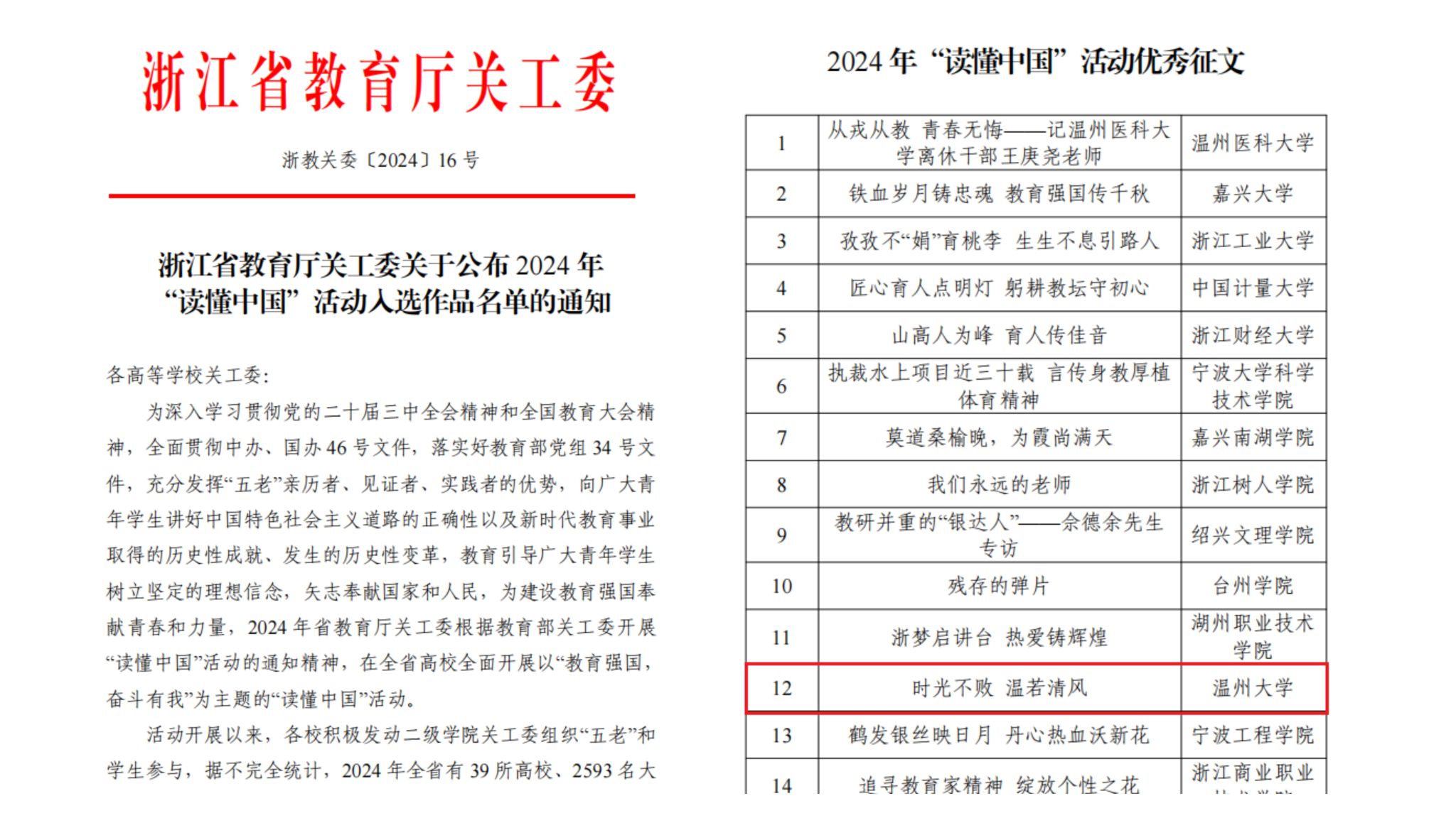 开云电子(中国)官方网站_开云电子(中国)官方网站离退休工作处精心组织推送的“时光不败 温若清风——原开云电子(中国)官方网站_开云电子(中国)官方网站魏萼清校长的教育情”文章,荣幸入选2024年“读懂中国”活动优秀征文名单。