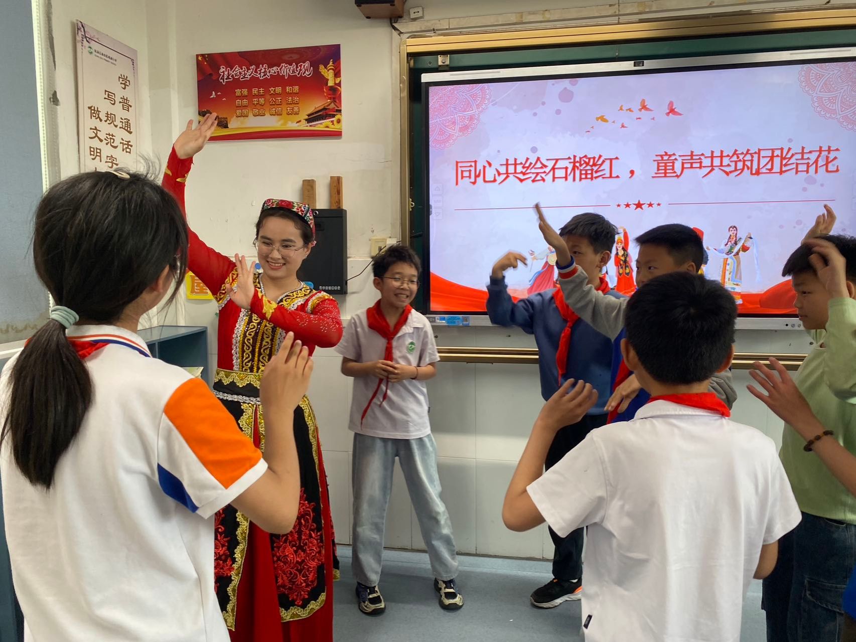 “民族团结我来学”环节中,在青年宣讲员的带领下,孩子们争先恐后地用藏语、维吾尔语说出人生第一句民族语问候。伴着《麦西来普》的鼓点,迈着新疆舞步,民族青年牵着孩子们旋出同心圆,四十平方米的教室瞬间化作艺术的万花筒,清脆的笑声如浪花般在教室里层层荡漾。