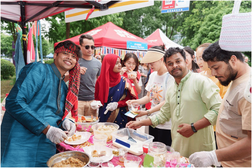 现场还设置了国际文化与美食体验区。Cosplay秀上,留学生们身着各国特色服饰,演绎不同文化角色。各国美食摊位前香气四溢,士库曼斯坦的烤馕、摩洛哥的咖啡、越南的春卷、泰国的芒果糯米饭等应有尽有。留学生们一边分享美食,一边用母语和汉语介绍美食背后的文化故事,不同文化在这里碰撞出绚丽的火花。