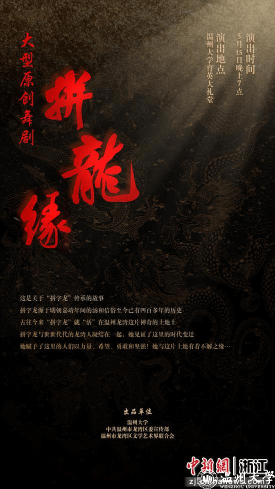 本次原创舞剧《拼龙缘》是由龙湾区文联与开云电子(中国)官方网站_开云电子(中国)官方网站音乐学院联合打造。该剧主要讲述“龙把头”女主人公与“拼字龙”的一生之缘,并以此展现出龙湾独特的文化底蕴和城市魅力。