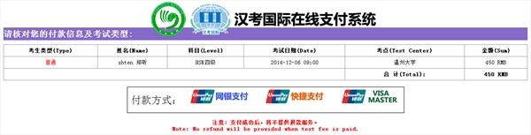 The new HSK test was launched by Hanban in an effort to better serve Chinese language learners. The test is the result of coordinated efforts by the experts from different disciplines including Chinese language teaching, linguistics, psychology and educational measurement. The new exam combines the advantages of the original HSK while taking into consideration the recent trends in Chinese language training by conducting surveys and making use of the latest findings in international language testing. Examination Date: 4th . December 2016 Online Registration:http://www.chinesetest.cn/index.do Registration Date: 9th. October 2016 --- 7th .November 2016 Notice: 1) Registration fee must be paid on line form before 7th November.2016. 2) After successful online registration, you will see the following page 3)please click ”pay on line” 4) After the successful payment, please send the screenshots of bank transfer record to email:wzuhsk2016@sina.com; and mark your name in the mail. We will modify your payment status. 5) No refund will be provided when test fee is paid. 6)After the successful registration and payment, the test taker can receive the confirmation information around 15 days prior to the test date, and may log on the registration website to print the test admission ticket, or take the test admission ticket at the exam outlet where he/she gets registered. Wenzhou University HSK Test Centre Address: Wenzhou University, Nonth Campus, Building 3, Room 316 Contact: Ms.Xu ,0577-86689370 Contact Email:wzuhsk2016@sina.com