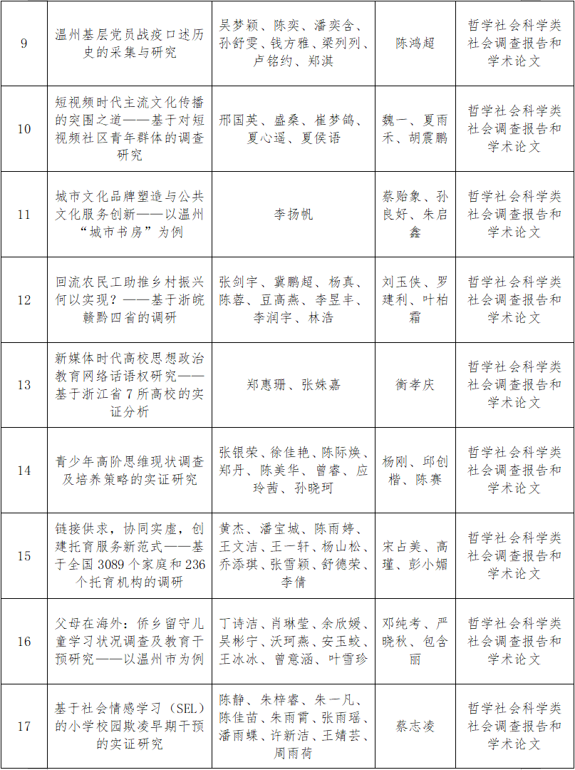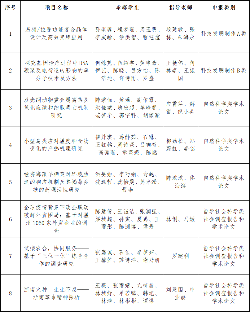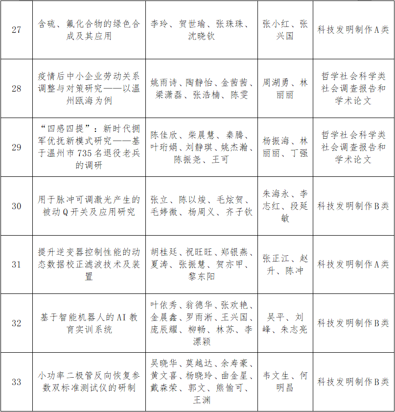 根据《关于组织开展浙江省第十七届“挑战杯”大学生课外学术科技作品竞赛的预通知》相关要求,经学校“挑战杯”校赛初赛、复赛等两次公开、公正、公平的选拔,现拟推荐《基频/拉曼功能复合晶体设计及高效变频应用》等33项作品代表我校参加浙江省第十七届“挑战杯”大学生课外学术科技作品竞赛。现将相关作品信息予以公示。