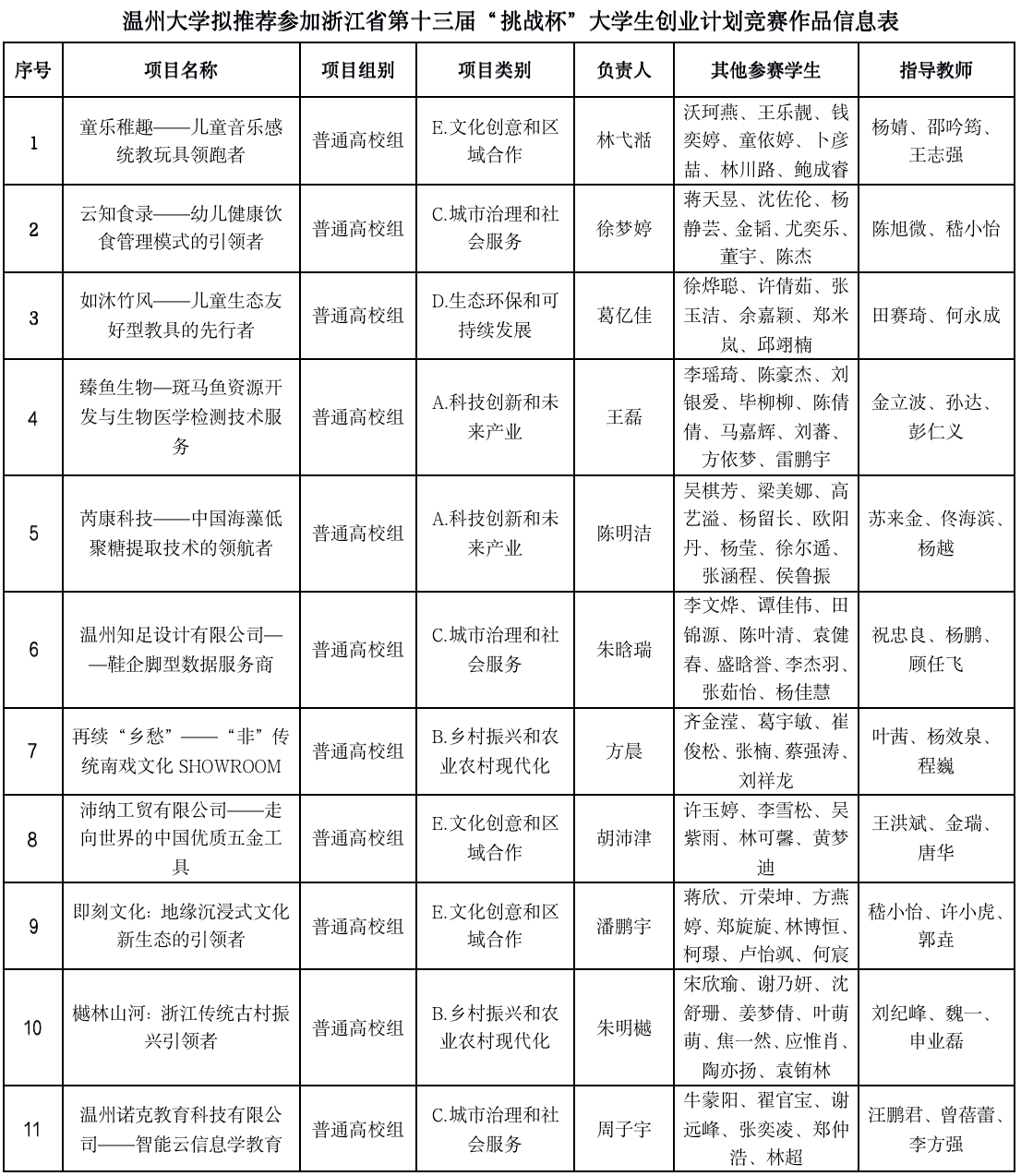 根据《关于举办浙江省第十三届“挑战杯”大学生创业计划竞赛的预通知》相关要求,经自主报名、院赛、校赛选拔,现将我校拟推荐参加浙江省第十三届“挑战杯”大学生创业计划竞赛的作品相关信息公示如下。