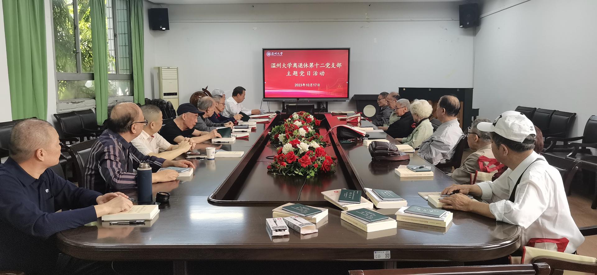 10月17日上午,温大离退休第十二党支部在学院路校区老干部活动中心举办主题党日活动,传达上级有关主题教育的文件精神,学习习近平总书记考察浙江重要讲话精神,研讨《习近平新时代中国特色社会主义思想专题摘编》部分章节,观看教育片。活动由离退休第十二党支部书记方乐平主持。