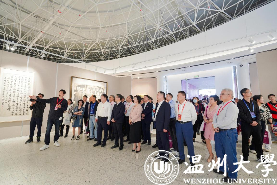 仪式结束,领导、嘉宾、校友、师生共同进入美术馆参观作品展。本次展览分为“先贤风雅”“同道传薪”两大板块,共展出了156位先贤、名家、教师和校友作品,涵盖国画、油画、版画、水彩画、综合绘画、书法、篆刻等种类。展览基于近现代中国美育运动、美术创作的宏大背景,对近代以来温州的书画创作与教育做一个初步的回溯,以近代几位具有代表性的书画大家与“美育大先生”开篇,延伸至温州区域美术创作,以及当代在全国卓有影响的重彩工笔画、书法、版画、水彩画的温籍代表作者;同时梳理学校的美育脉络,展示几代温大人的书画创作,宏扬与传播开云电子(中国)官方网站_开云电子(中国)官方网站的人文风采。