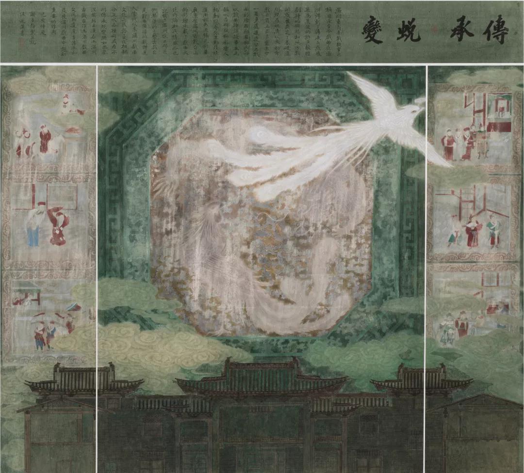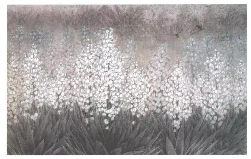 谢子静的作品以恬静、典雅、淳朴、淡泊为主旋律,而积极向上,热情乐观则是作品精神的内涵。在立意造景方面,看似寻常,但却能给人以无限遐想。如《秋露》图,画面右侧,一株强劲有力的剑麻直线挺然而立,远处数株风姿自然,并巧布在画面右侧以曲线多变的外形,构成一大空白。空白的一侧,隐藏着两只相依的禽鸟,使画面别开生面,既增添了联想的空间,又活跃了画面的气氛。意的妙趣,情的缠绵,赏之有回味,读之有余音。这种寻常的造景立意,能取得如此的艺术魅力,全在思维的敏捷,想象的豁达,虚实的巧布,笔墨的机灵。在构成布置方面,虽无惊险奇特之举,然而能让人感到平中有变、平中藏奇的感受。如《青剑》图,几株茁壮的剑麻平行直线排列,几只蜻蜓横向飞行,从画面构成来看,是一幅极为简单的纵横直线相交组合。由于平行中有耐人寻味的变化,交叉中有捉摸不定的穿插,在不经意中把那种朴实、纯洁、天然、自在的艺术情味表现得十分得体,给人以辽阔、深远、新奇、大气的美感。在设色方面,很少采用强烈夺目绚丽的色彩,而是以清淡典雅作为基调,于淡中求变化,淡中求韵味。刻意追求物象神质情态的表现,以达到最强度的艺术感染力。如《蒹葭苍苍》图,作品以平日里采风、写生途中所见的芦苇与嬉栖的白鹭为画材,旨在表现自然界动人和谐的一幕,寄寓着摆脱尘俗,融入超逸的自然景界,抒发了一种美好的心境。画风以宋明院体花鸟画之雍容谨严为典范,参以文人画逸笔的幽远意境与简澹设色,营造画者心中氤氲已久的古典幽梦。篇幅宏阔,意在改变历代花鸟画常见的小品格局,赋予作品以富有张力的现代视觉形式效果。如《荷风送香》图,整幅画面如同一曲抒情的轻音乐,使人沉浸而陶醉。青绿色的荷叶,在淡泊中见有沉甸厚重之感,叶面周边施以淡赭,不仅取得温柔的冷暖对比效果,也把荷叶的生态美表现得鲜活纯真。白色的荷花,着粉不滞板,恰到好处,把花瓣沉稳而透亮的质感表现得极为优美。月黄的莲蓬更是意气妖态,飘飘然而欲舞,默默然若移步,似有清香袭人,如临野塘晨风,水天一色,花草和谐,赏之悦目,读之心怡。这种境界正是谢子静匠心用色所追求的艺术情趣。《传承.蜕变》是谢子静近期的创作作品,画面表现的是温州古戏台的一组组戏曲彩绘图饰,辅以吉祥纹饰。彩绘人物动态夸张、生动,线条运用娴熟、流畅,色彩斑驳、厚重,以传统的工笔重彩技法记载了温州戏曲文化与民俗文化。作者正以其特有的视角和方式关注温州戏曲文化遗产,倡导温州南戏的传承与蜕变。更有得一之想的是画面以一只飞鸟置于前景,将不同时期舞台的图饰作为背景,达到穿越时空的联想。以花鸟画的形式来表达戏曲的题材内容可能当属首次,这充分说明作者对事物观察的敏锐性和大胆创意的精神,关注其传承与蜕变。