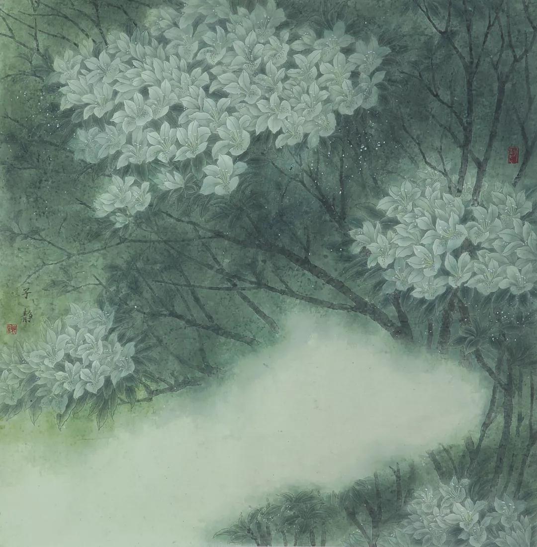 谢子静专攻中国花鸟画,对大自然的一花一鸟,一草一石均投以极大的热情与兴趣。她时时被这些物件的优美情态所感染,情急之下便命笔记写,反复品味,不断揣摩,并联想前人的艺术表现,使这些生动可爱的对象,升华为初步的艺术形象存记于脑海之中,这为她的艺术创作提供了丰富的自然原始素材。平时,除了虚心跟随名家学习外,还十分重视研习前人的传统艺术表现方法,尤其是宋人的花鸟画,使她产生了浓厚的兴趣。在临摹经典作品时,不仅力求神貌皆合,并把精力集中在探讨其原因、寻找其规律、挖掘其奥妙之上。从取材、构图、创意、表达等多方位加以硏究,常常以一个探宝者的心境去逐一玩味,直到有所领悟。这种科学而严谨的治学态度,奠定了创作的坚实基础。