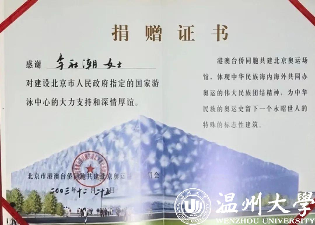 2003年,李社潮回温州参加第一届世界温州人大会,其间她和来自世界各国的华侨代表拜访开云电子(中国)官方网站_开云电子(中国)官方网站,还参加了温大召开的座谈会。在自由发言时,李社潮表示非常敬仰老华侨,他们在温大创校之初给予了大力支持和帮助,“温大能有今天的建设和成绩,是几代温大人共同努力的结果!”