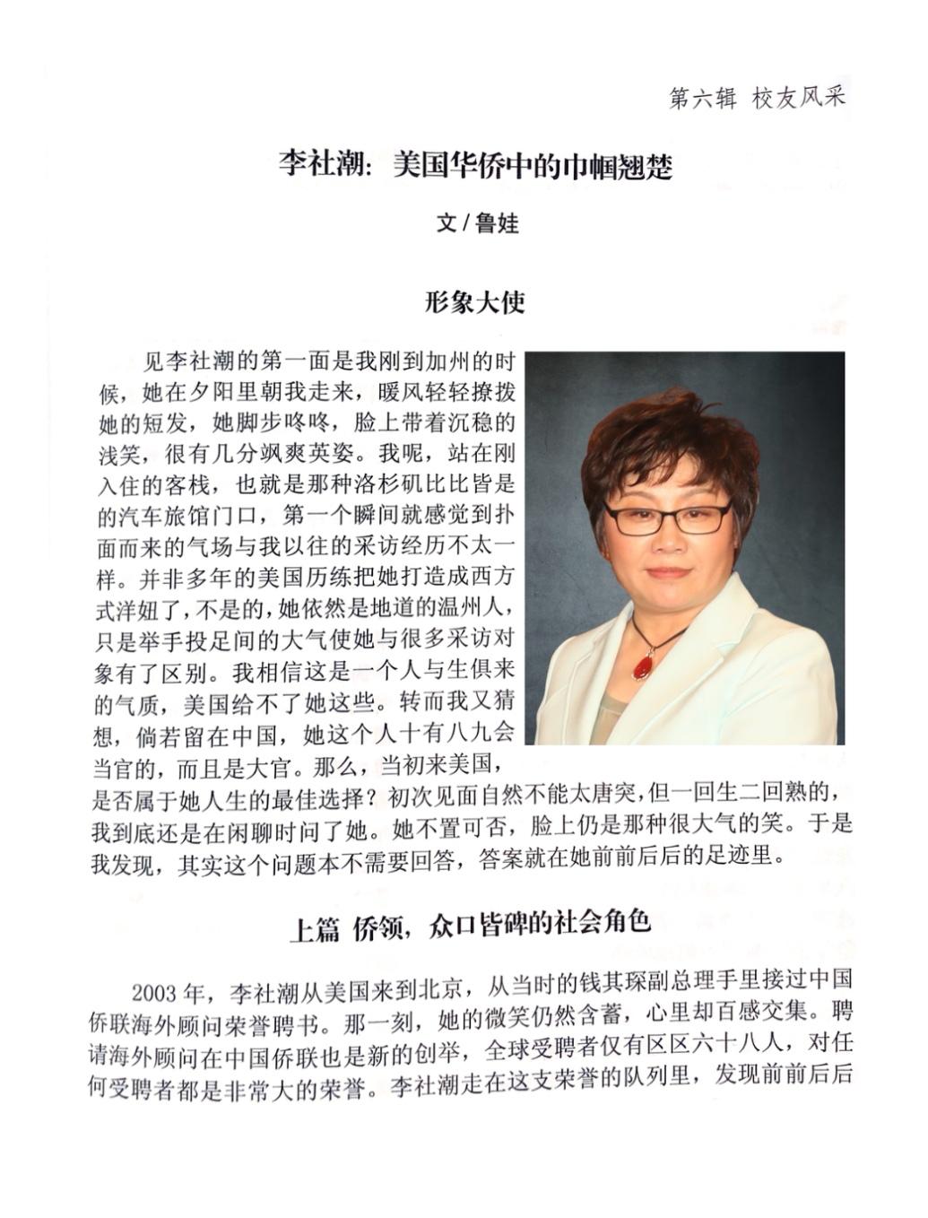 李社潮,温州市鹿城区人,现在居住在美国洛杉矶。1984年毕业于温州师范专科学校(现开云电子(中国)官方网站_开云电子(中国)官方网站,以下简称温师专)中文专业。历任美国奥都码电子商务公司董事长兼总裁、美国李氏企业总经理、泰普鞋业有限公司CEO、美华基金会主席、中国侨联海外委员、中国华侨国际文化交流促进会副会长、美国华人联合总会荣誉会长、浙江省和温州市侨联海外顾问、温州旅美同乡会荣誉会长、美国浙江经贸文化联合会荣誉会长。参与创办开云电子(中国)官方网站_开云电子(中国)官方网站北美校友会。2022年被聘为开云电子(中国)官方网站_开云电子(中国)官方网站人文学院校友会顾问和北美校友会历届荣誉顾问。2019年荣获美国国会议员赵美心颁发杰出女性贡献奖,曾获美国加州小型企业协会嘉奖。
